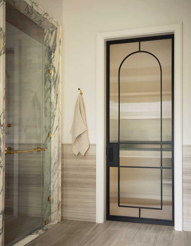 A tailored metal-framed door brings interest to the ensuite.