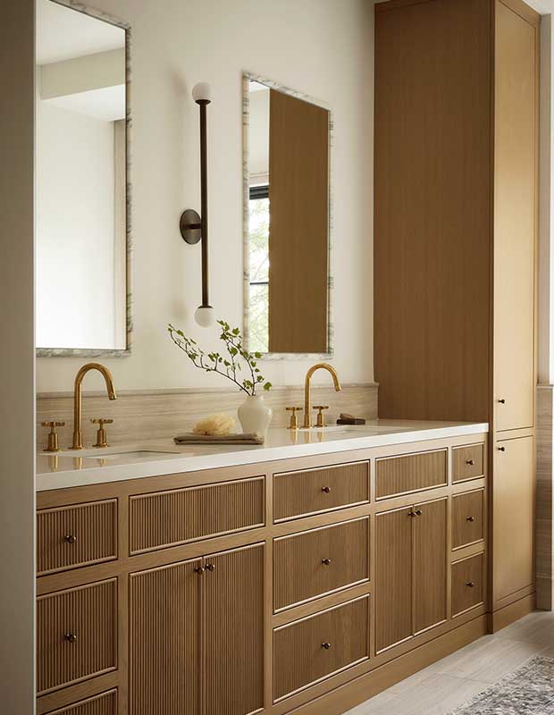 A micro-reeded vanity is textural in the principal bathroom; marble-framed mirrors and a bronze sconce are elegant.