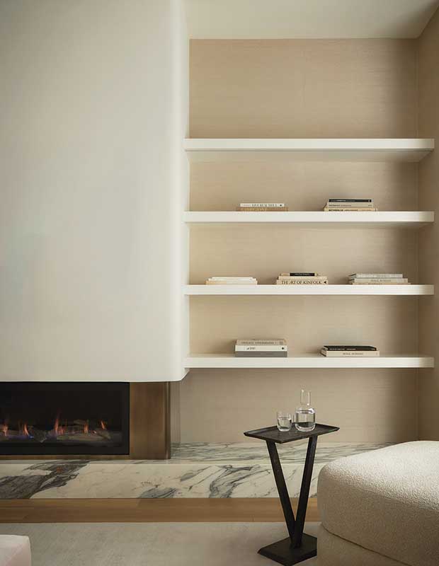 The principal bedroom fireplace is recessed on a raised marble hearth and has a drywall chimney breast that curves into the wall next to open shelving. “It creates a really nice moment,” says Elyssa.