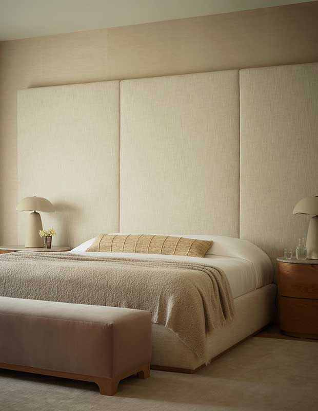 A custom off-white headboard goes almost to the ceiling, adding a touch of drama in the principal bedroom. “We kept everything else very calm and neutral with layers of textures including silk, linen, velvet and mohair,” says Elyssa.