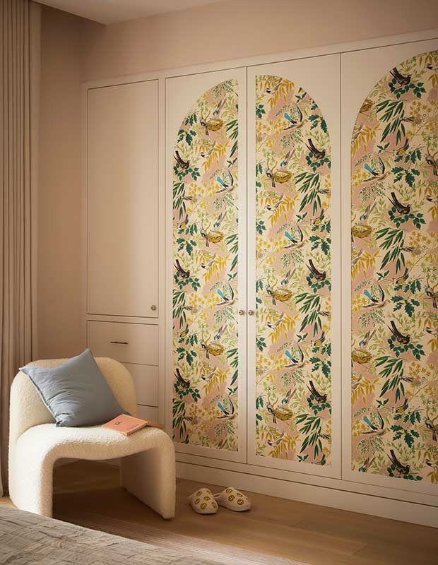 In the older daughter’s bedroom, Elyssa added charming wallpaper featuring birds and foliage to the bespoke wardrobe. A bouclé accent chair creates a cosy reading nook. “We wanted to be fully involved and, with Elyssa’s help, our home turned out to be exactly what we were looking for,” says one owner.