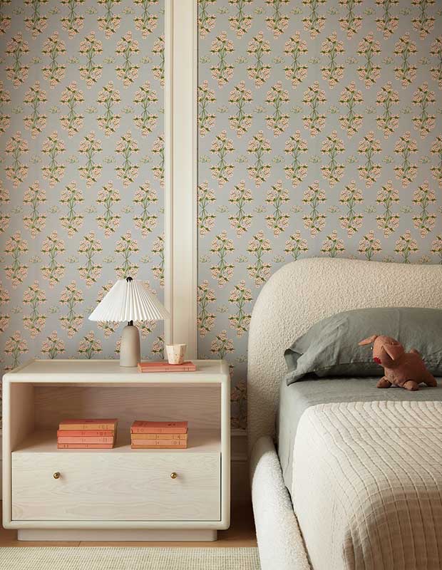 This wallpaper in the youngest daughter’s bedroom has a nostalgic feel. Paired with a bouclé bed frame with curved headboard, the space is relaxed and comfortable.