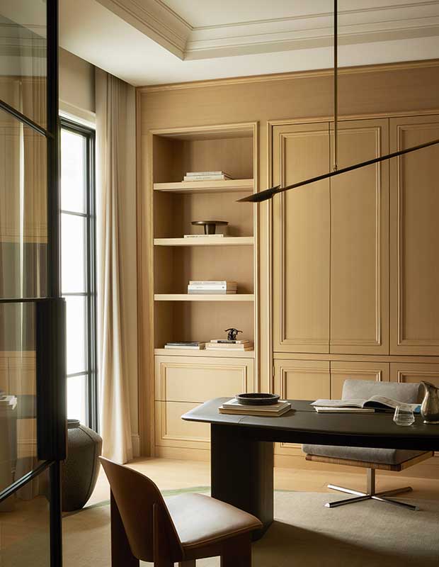 The client’s office is handsome and understated. “I saw this light fixture years ago and knew I’d use it somewhere in this house,” says Elyssa. “It’s minimalist and quiet, but it makes a statement.”