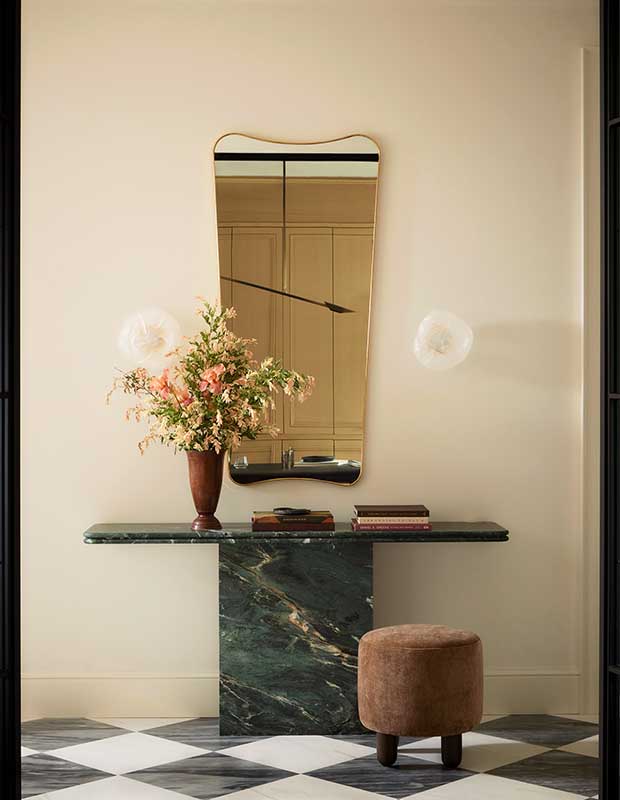 The checkered dolomite and Bardiglio Dark marble floor and a Verde Alpi marble console contribute to the welcoming vignette in the foyer. “Whether it’s a light fixture, metal-framed door or spectacular piece of furniture, there’s an element that makes each room feel special,” says Elyssa.