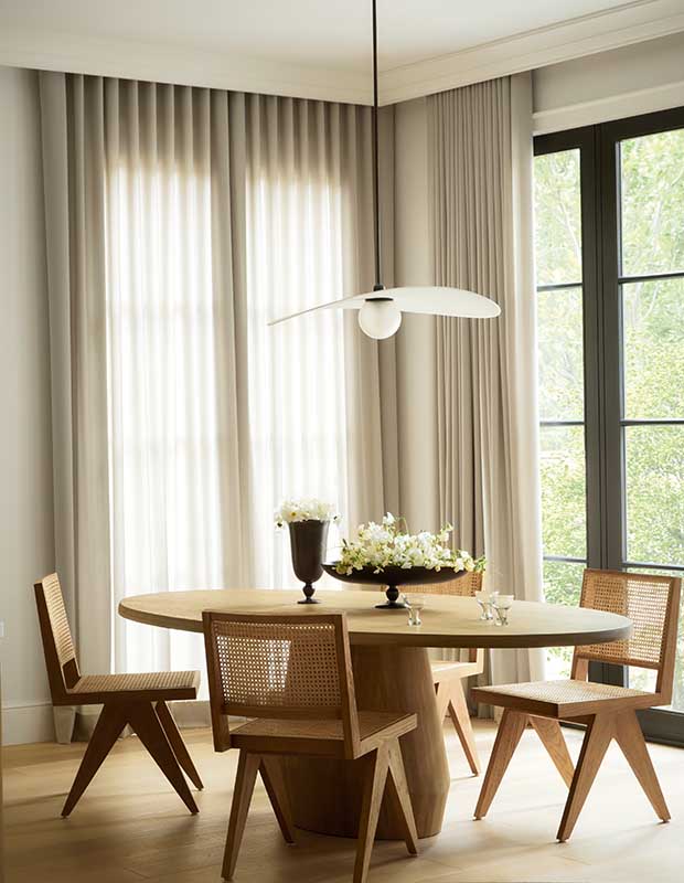 With light-filtering drapes and pale wood tones, the dining area off the kitchen is a serene spot for the family to connect.