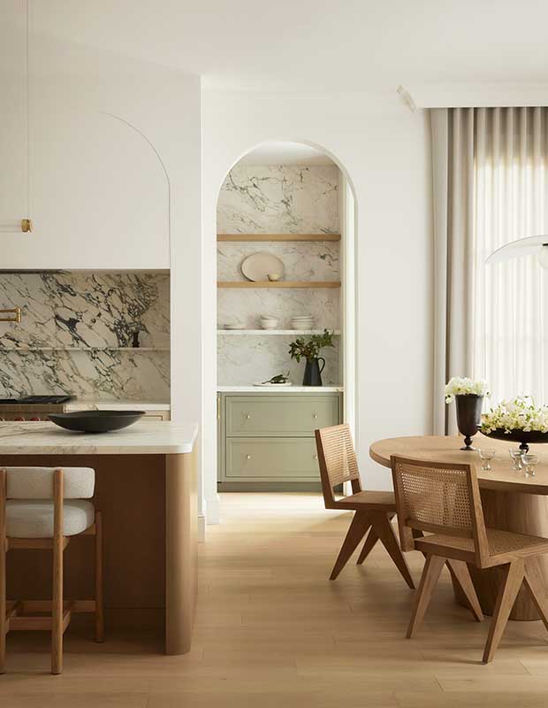 The planning, build and design took nearly three years to complete; the family moved in last May. It was well worth the wait, they say. For Elyssa, there’s much to love: “My clients pushed for subtle hints of colour throughout; I love the pale green servery and the blush chairs in the living room,” she says. The designer also added statement lighting by Gabriel Scott over the kitchen island. “But it’s really the understated elements that make this home so beautiful.”