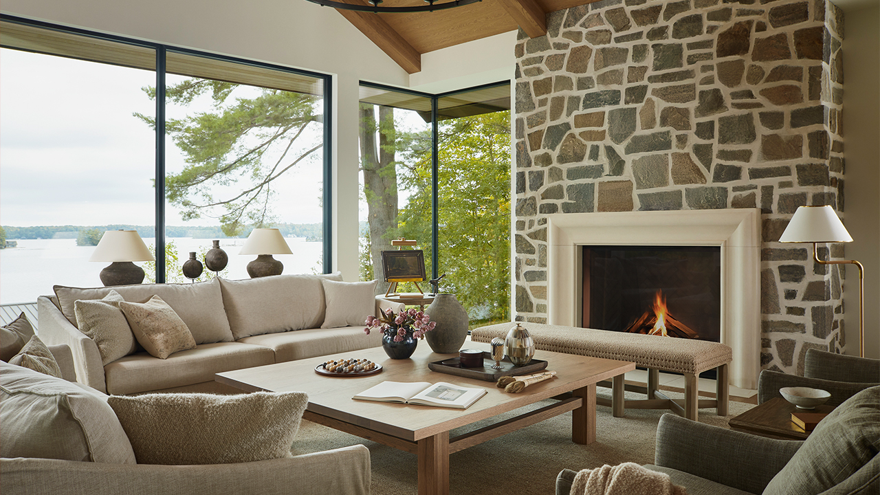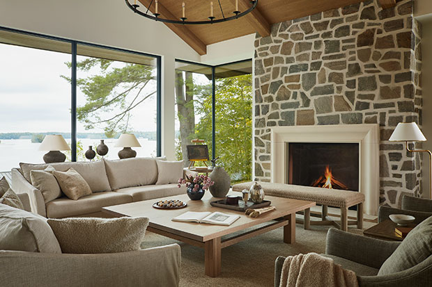 The large communal areas lean in to classic cottage fare, including fieldstone for the fireplaces, wood panelling on the walls and other natural materials that will age gracefully over time. “The property is so lush,” says Brittaney. “Every window looks out to forest or lake views, so we took inspiration from the hues of the landscape when refining the interior palette.”