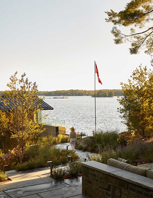 A pathway links the cottage’s stone terrace to the two-storey boathouse, which includes more guest quarters.