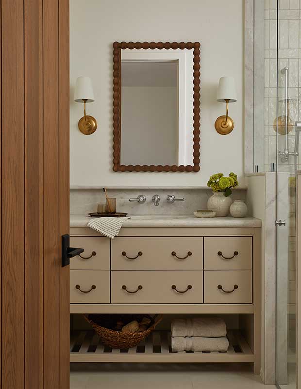 Each bathroom has its own distinct style, whether that means a quaint, cottagey vanity in a neutral taupe with a bobbin-framed mirror above, or the sleek principal ensuite, where a sculptural stand alone tub is elevated and framed by a woodsy backdrop.