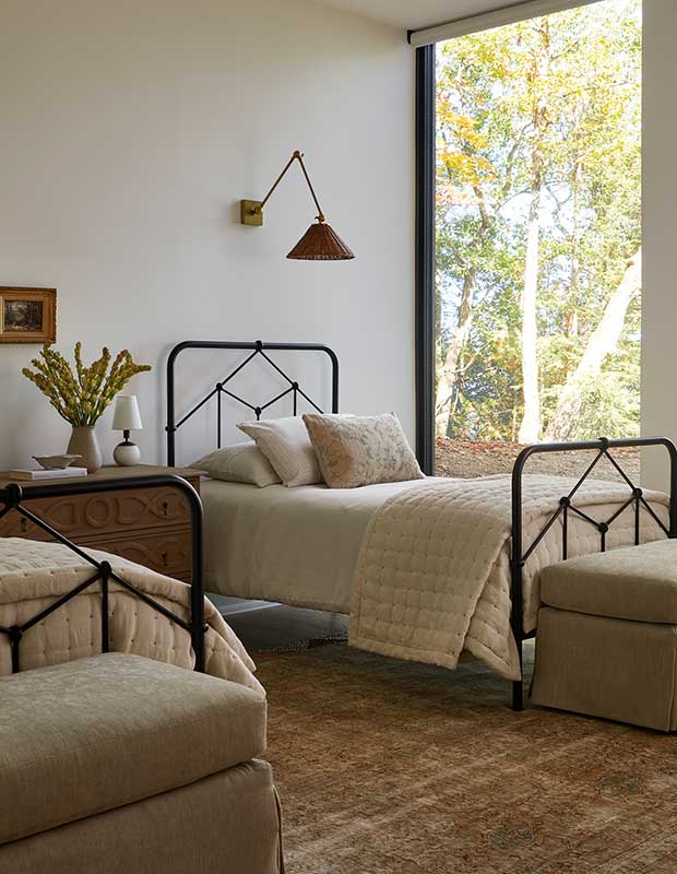 This guest bedroom is ideal for kids; sconces allow for bedtime reading and ottomans with built-in storage stash toys.