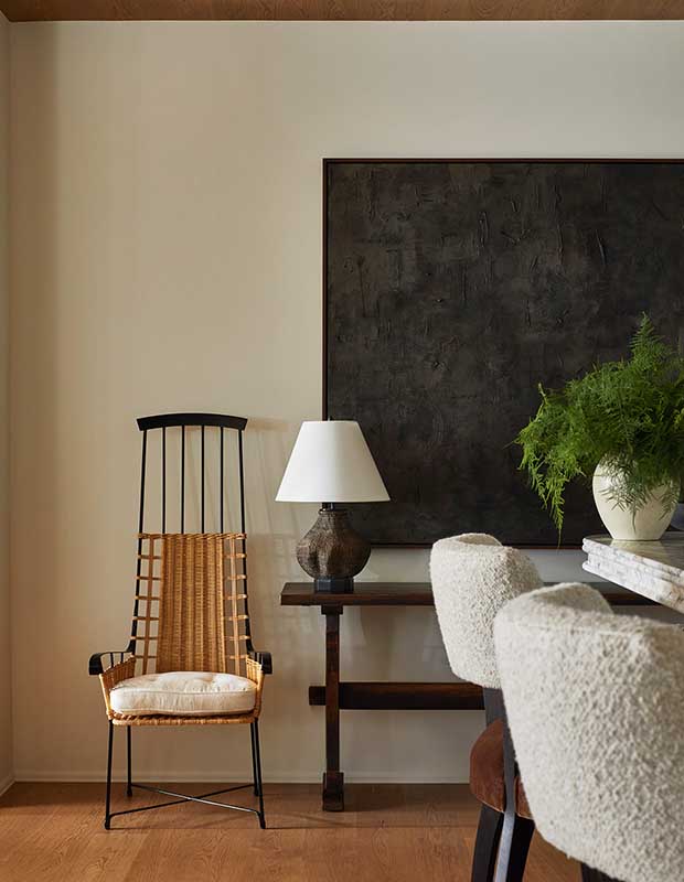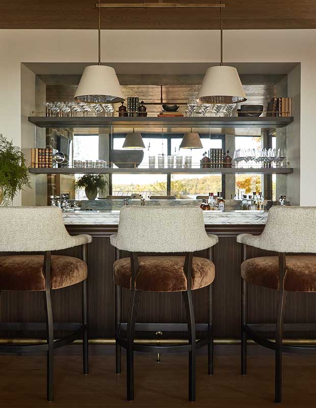 The rec room’s barstools have brown velvet seats and contrasting creamy bouclé backs. An eye-catching chair and moody art add visual weight.