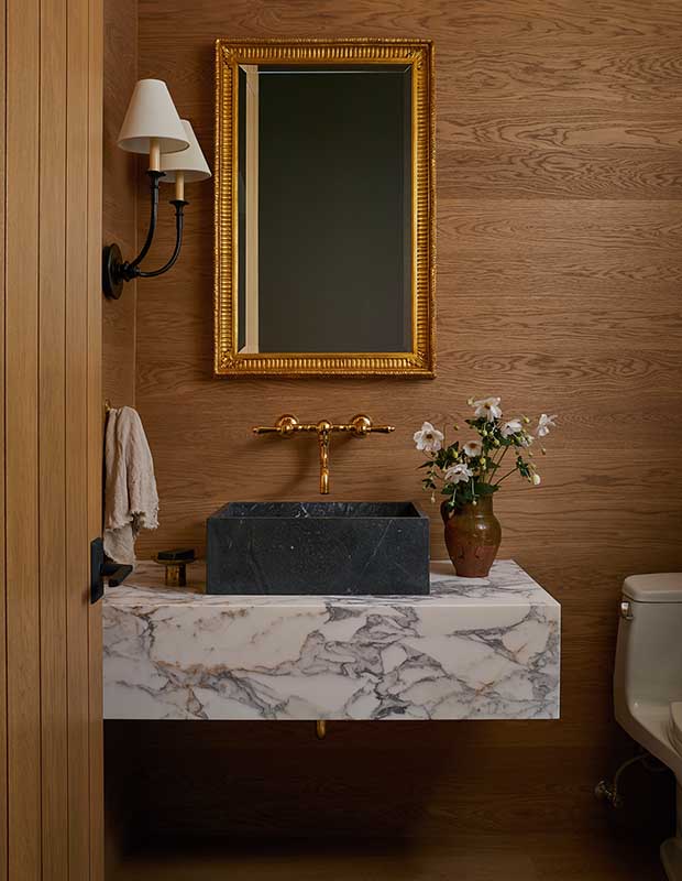 A dramatic Arabescato marble vanity sets off the leathered black sink and unlacquered brass faucet in this powder room.
