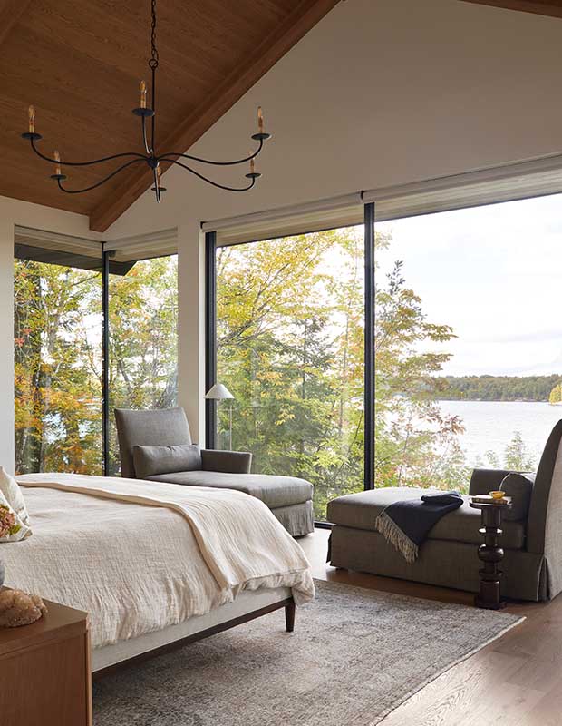 Low-profile chaises longues for reading and relaxing don’t detract from the lake views in the serene principal bedroom.