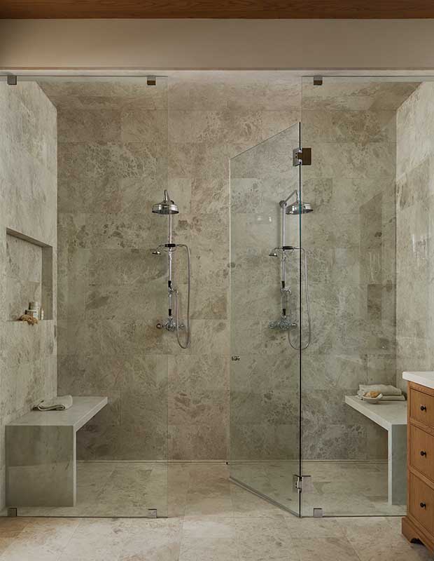 Expanses of honed Silver Shadow marble, complete with integrated benches, define the principal ensuite’s double shower.