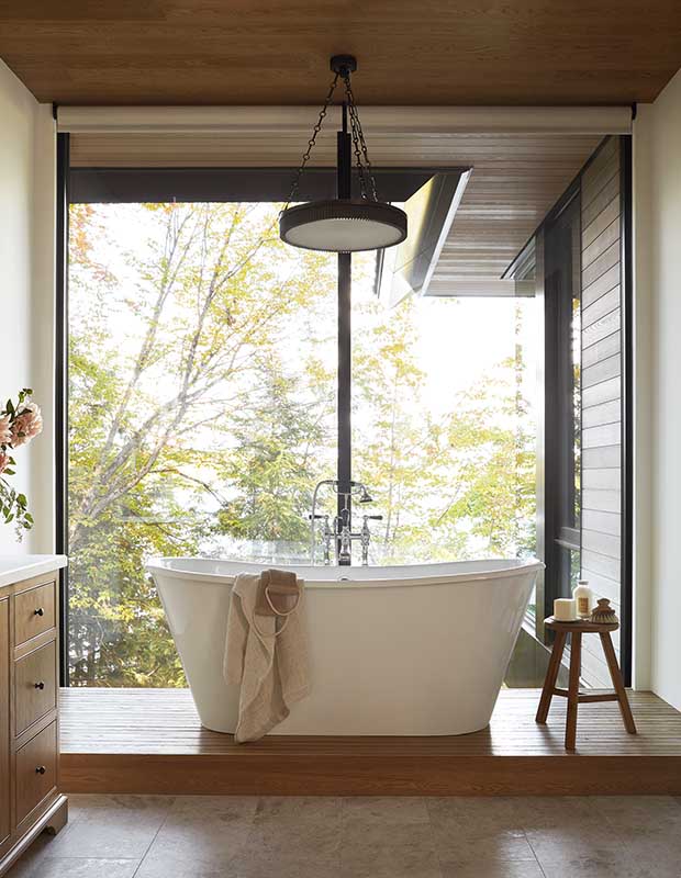 It was quite a Mother’s Day gift. Lisa and Paul Cummings began building their new 8,000-square-foot cottage on Muskoka’s Lake Joseph in 2021, which culminated in a surprise reveal for Lisa last May. “Lisa thought it was a routine check, but we were working around the clock with different delivery teams to take it from post-construction cleaning to completing the final touches with linens, art, accessories and rugs,” says designer Brittaney Elgner. “On reveal day, all three adult children were here with wine and a charcuterie board: the whole family was assembled to see the finished house together.”