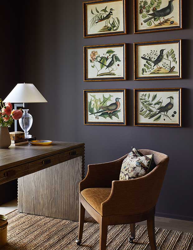 Deep mink walls and a grid of bird prints are natural notes in this compact study.