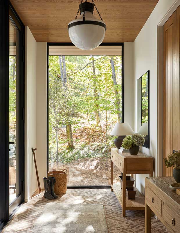 The foyer leading to the mudroom features a reclaimed brick floor in a herringbone pattern. Matching consoles flank the door.