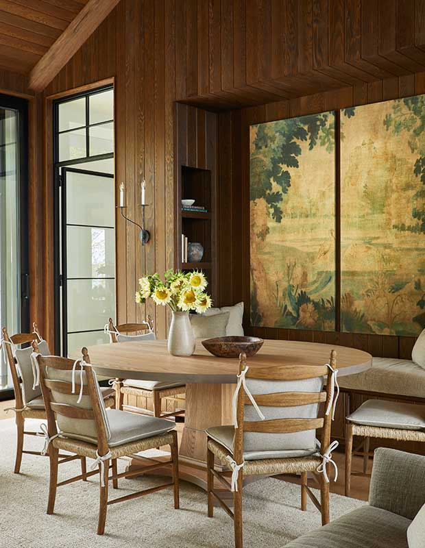 In the Muskoka room, a scenic tapestry print fabric in a wood-panelled niche is a charming focal point.