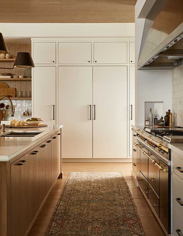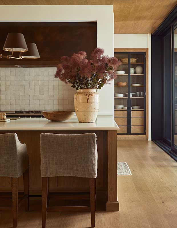 The expansive kitchen features natural materials including a striking brass vent hood, zellige tile backsplash and a mix of woods.