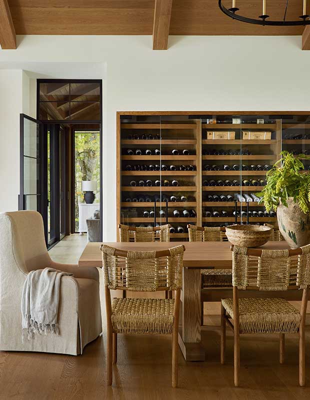 The dining table accommodates 14; a custom white oak wine storage system houses Paul’s extensive collection.