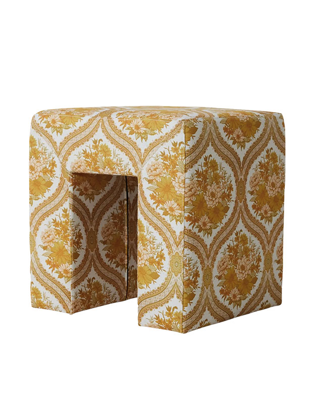 The lobby stool has a compact, boxy design and is upholstered in a bouquet repeat print. Perfect as a bold accent for a small space.