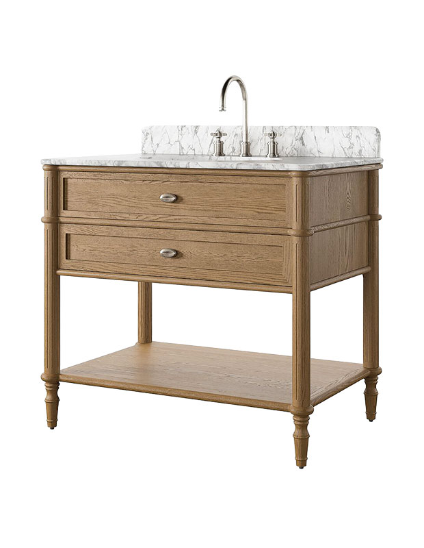This traditional Carrara marble–topped vanity has an antique furniture feel with its rounded corners and tapered spindle legs. The backsplash and basin are included, and the open shelf provides additional storage.
