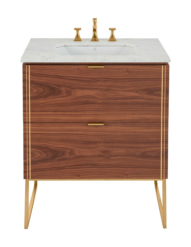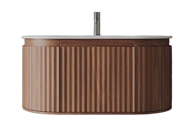 A Euro-style contemporary vanity with reeded details in a walnut finish and an integrated stone counter and basin.