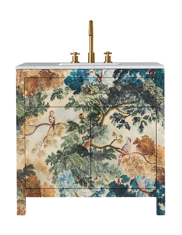 Wrapped in canvas printed with a botanical scene in watercolour hues, this striking vanity has a bold, painterly vibe. The marble top and basin are included.