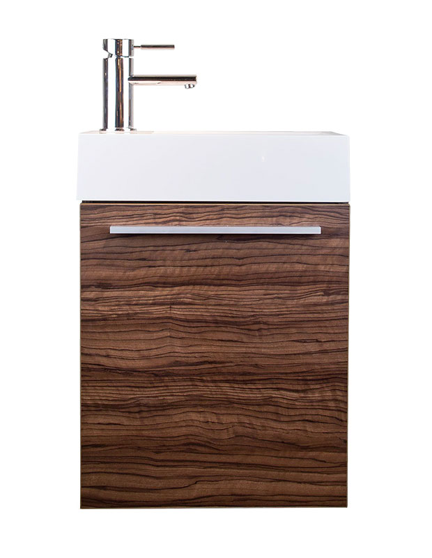 This floating vanity with a dramatic wood grain finish features a single brushed metal pull. Designed to support the Studio basin.