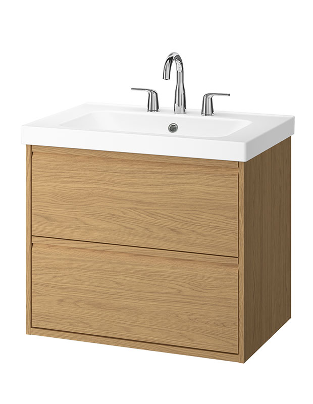 This minimalist, budget-friendly vanity includes the cabinet with drawers, the ceramic counter and basin, plus the faucet and water trap! Drawer pulls are integrated for a streamlined look.