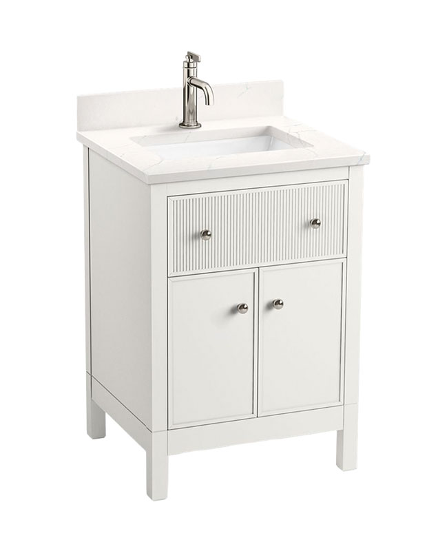 The reeded drawer front and classic hardware give dimension to this quartz-topped vanity by Studio McGee for Kohler.