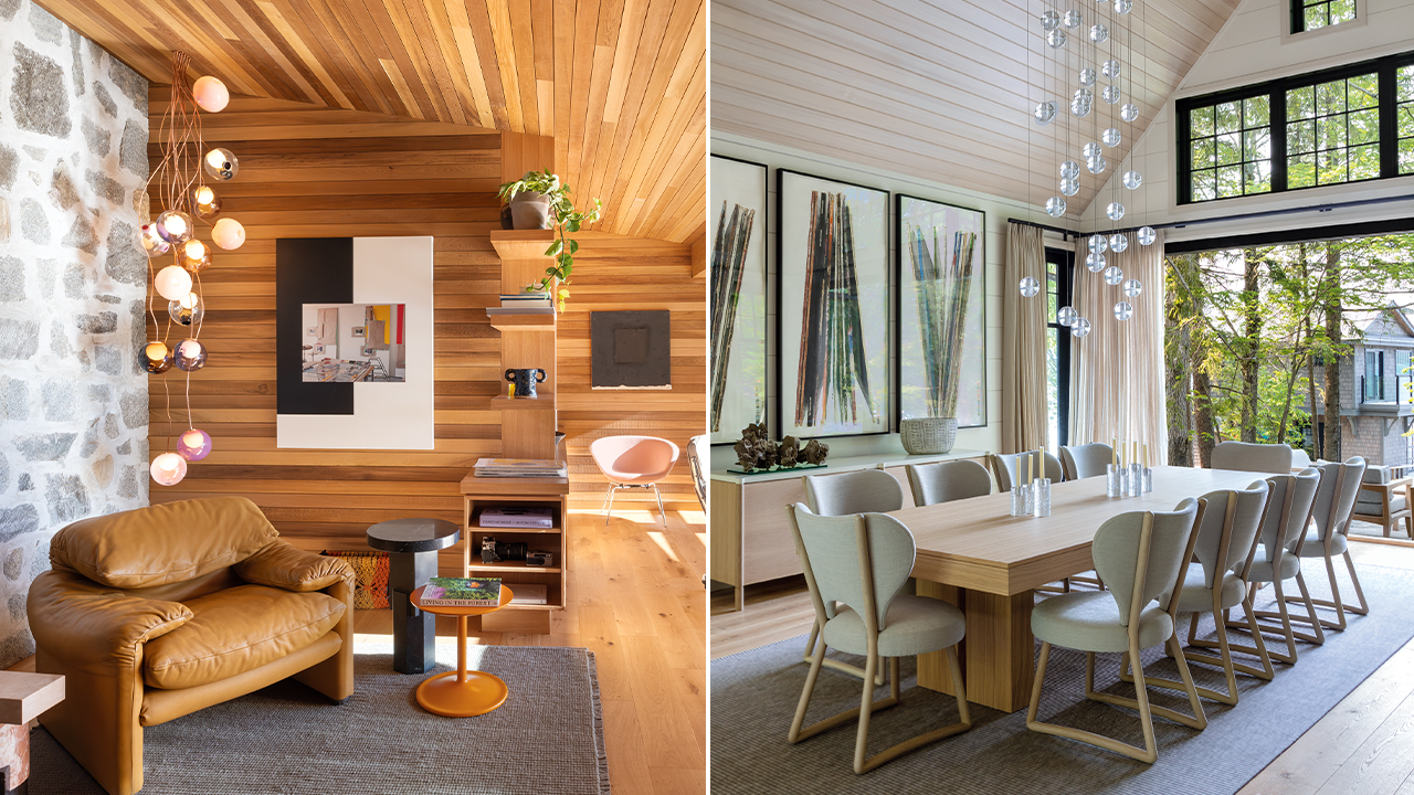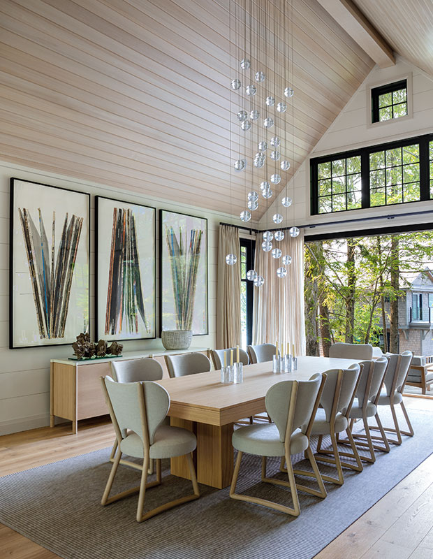 To fill the vaulted ceiling space in this dining room, designer Christopher Spraggett hung a glass sphere chandelier. The fixture plays up the contemporary vibe of this Muskoka cottage without interrupting the view to the outdoors.