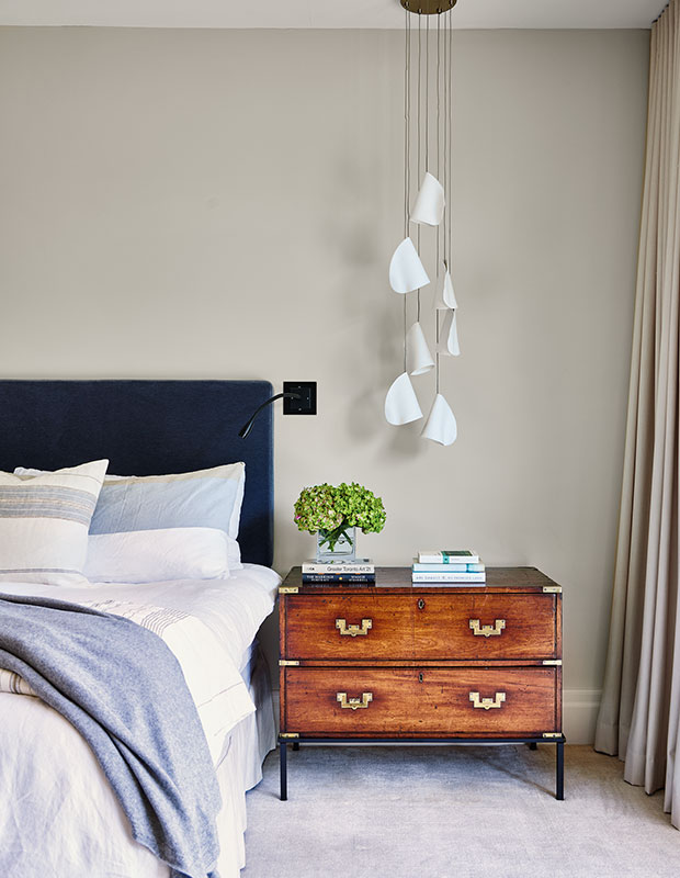 Designer Kate Zeidler illuminates this bedside table with a Bocci pendant, a modern touch to complement the classic nightstand. “I like things that are usable and last forever,” says Kate of her timeless aesthetic.
