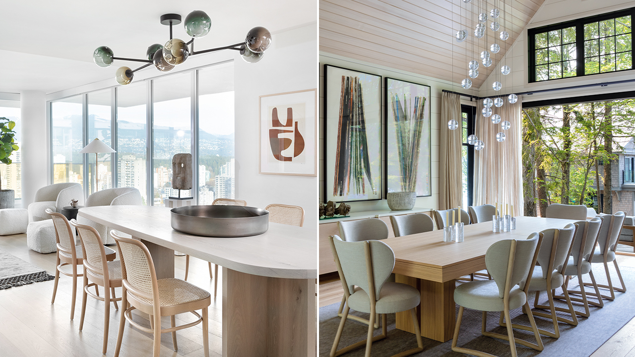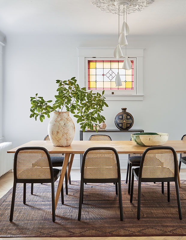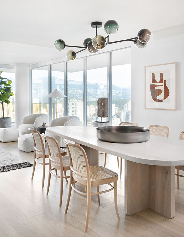 Alda Pereira selected a Bocci fixture to create contrast in this bright Vancouver condo. The light’s dark baubles and black frame create a sense of moodiness that adds depth to the room. A solid-wood dining table with an organic shape evokes the look of the fixture.