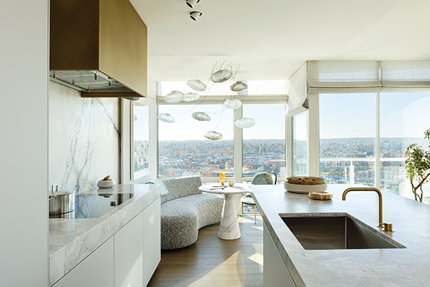 Bocci lights hung by the window mimic clouds in this Vancouver pied-à-terre. “We took our clients to Bocci’s glassblowing studio, and she fell in love with the fixtures,” says designer Chad Falkenberg.
