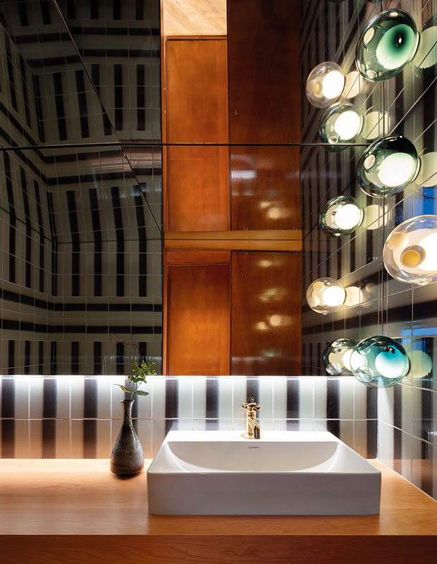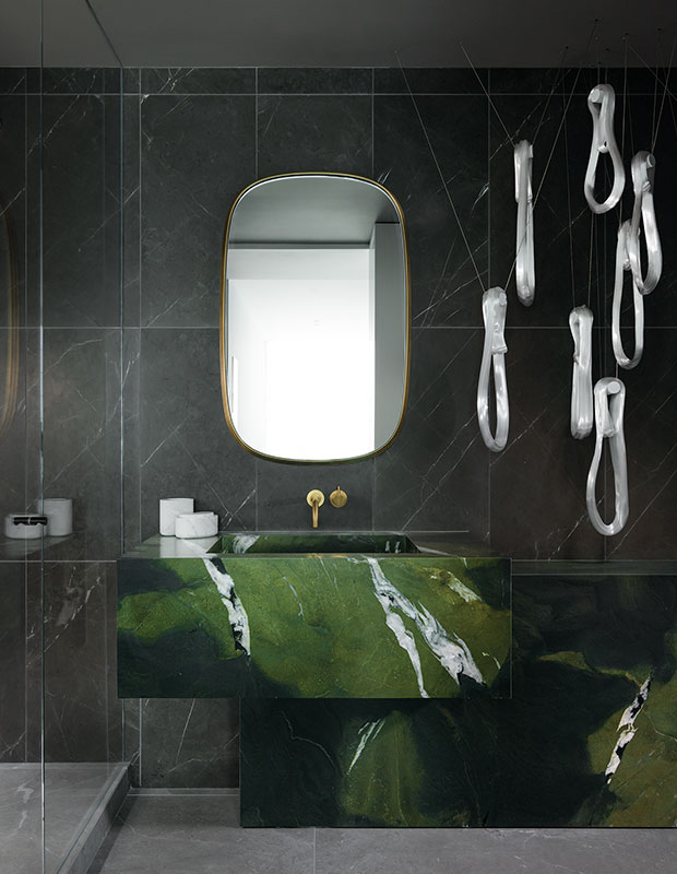 A dark bathroom is brought to life with an Avocatus quartzite vanity. Its prominent veining echoes the iridescent hue of the Bocci 84 pendants that hang nearby. “The glass-encased copper on the pendants create a warm, glowing reflection that feels like candlelight,” says designer Kelly Reynolds.
