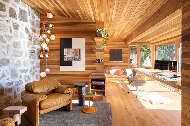 In this North Vancouver home office, a reading nook is given a whimsical upgrade with a colourful Bocci light that cascades down from the ceiling. A pair of vintage butterscotch-hued Maralunga lounge chairs add to the 1970s-style appeal of the space.