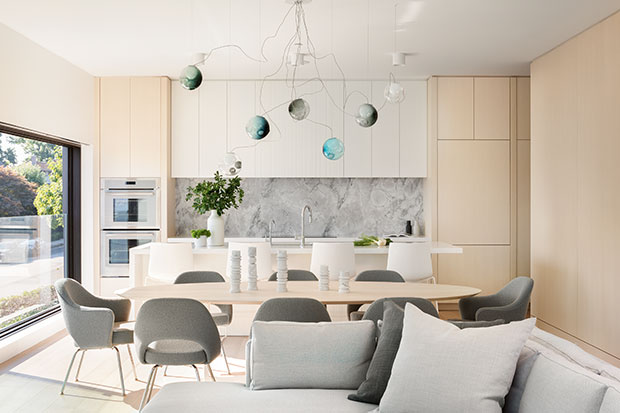 Designer Stephanie Brown decorated this minimalist kitchen and dining area with a striking fixture above the table. “We were able to select the glass colours to support the clients’ artwork and outdoor tones, and we placed the globes so that they wouldn’t obstruct the view,” she says.