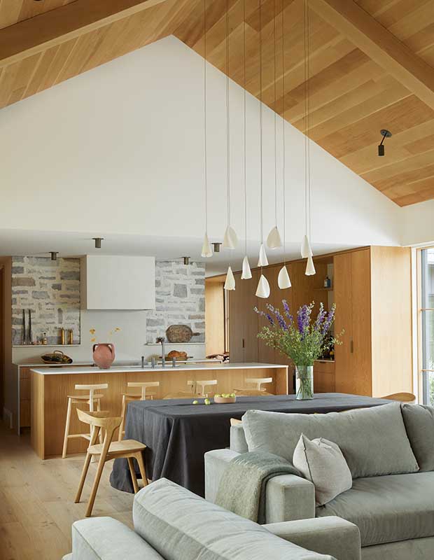 Designer Sam Sacks selected delicate Bocci pendants to hang above the dining table in this newly built country house. The light strikes a modern balance against the Douglas fir-clad ceilings to achieve a balanced contemporary country style.