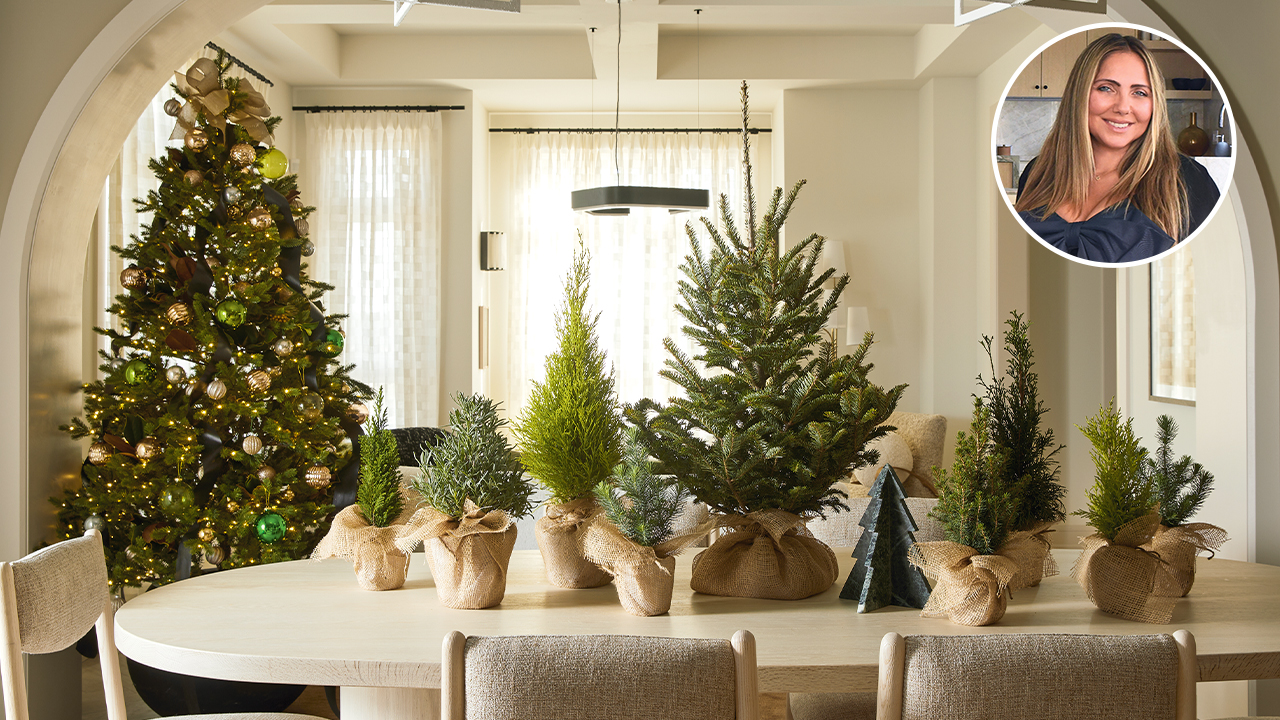 A chorus line of mini potted trees wrapped in burlap is a fresh alternative to a more traditional centerpiece.