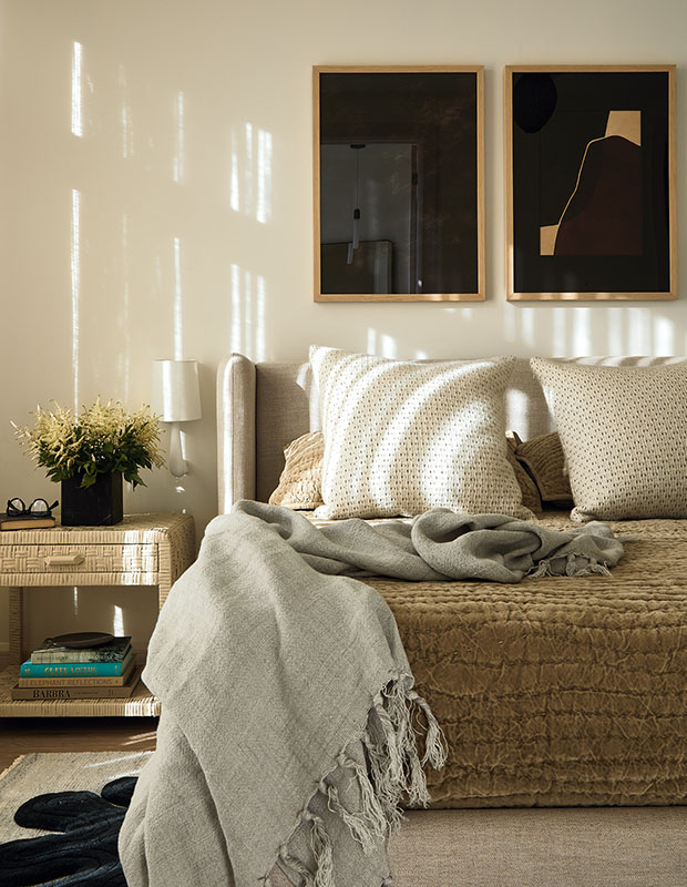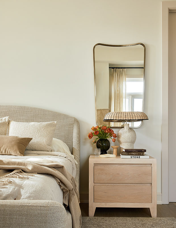In the principal bedroom, a textural upholstered headboard, pale oak nightstand, cast lamp with wicker shade and velvet accent pillow are a cool mix.