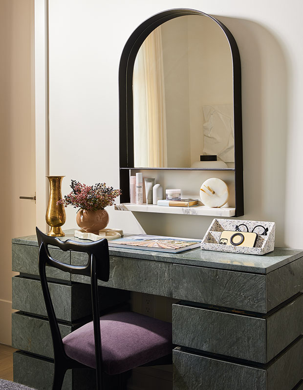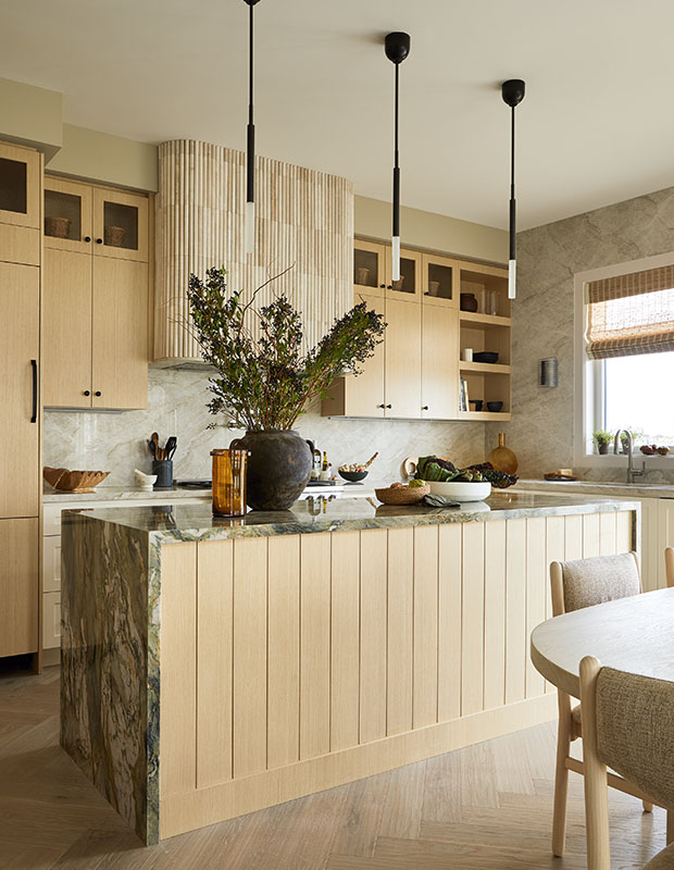Taj Mahal quartzite for the backsplash and perimeter counters, and a grey-green granite for the island define the standout kitchen. Because the island’s not obscured by stools, Sabrina panelled the face with a linear treatment that leads the eye to the innovative vent hood, where she mimicked a fluted finish by ingeniously stacking travertine pencil trim tile moulding.