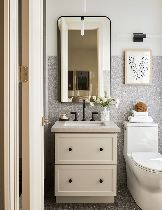 Terrazzo and a black faucet bring a cool, modern vibe to this ensuite.