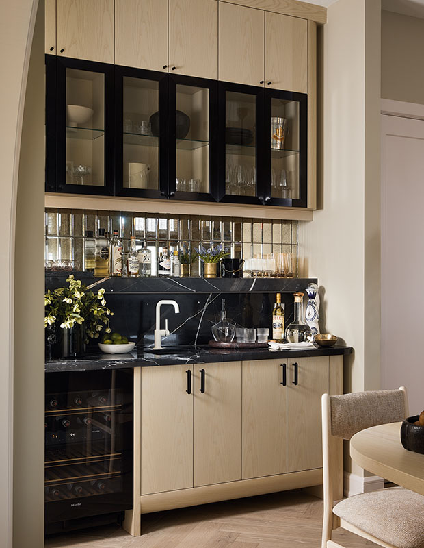 In the bar, a white faucet is set off by the Calacatta Black marble shelf, backsplash and counter.
