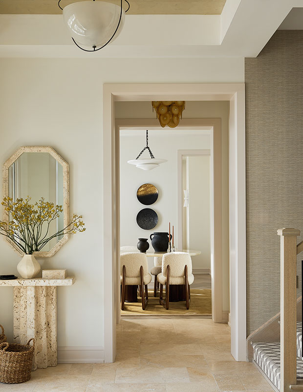 The sight line through to the dining room shows a bold grouping of artisanal objets.