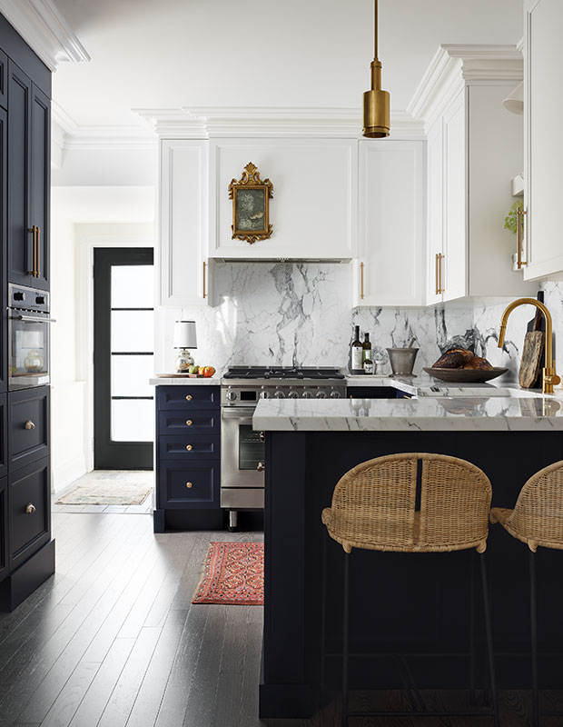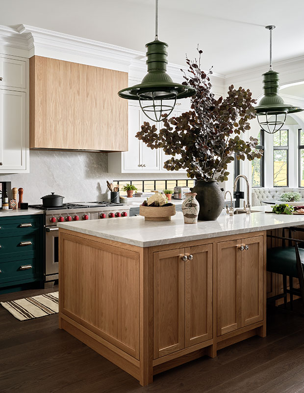 Tommy combined oak vent hood cladding, beautifully veined stone, and painted uppers and lowers in contrasting shades for an eclectic mix. “Large kitchens can feel like an airport terminal if everything is white,” says Tommy.