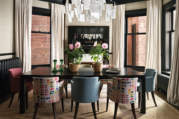The dining room chairs are upholstered in a mix of fabrics. “We love the colour and whimsy they bring to an otherwise masculine-feeling space,” says one client.
