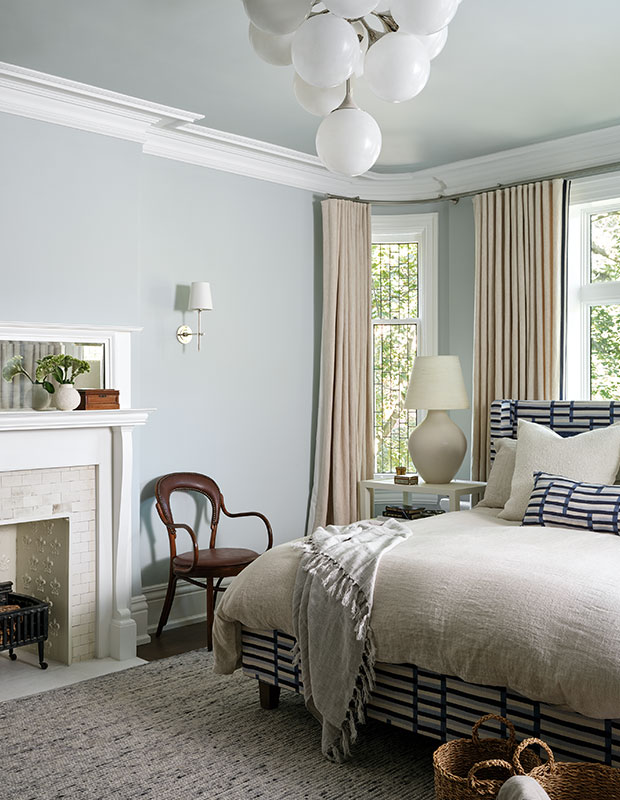 Farrow & Ball’s Skylight is a serene backdrop in the principal bedroom.
