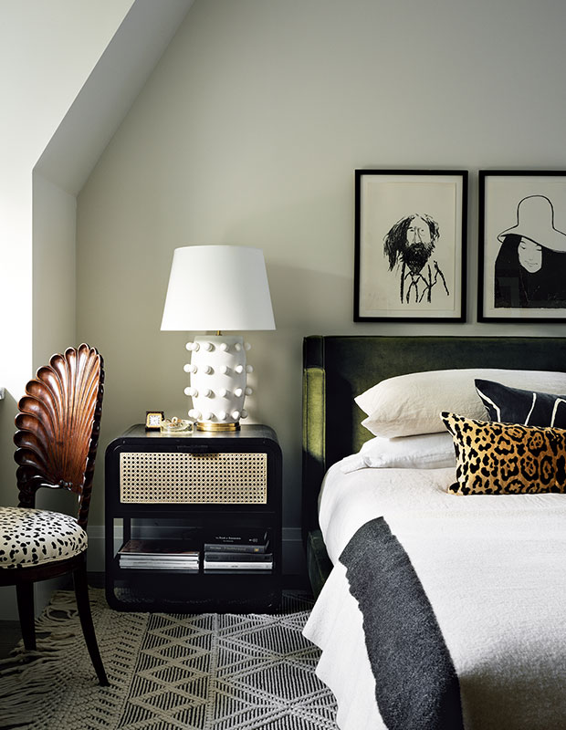 In the principal bedroom, a scalloped chair with a spotted seat is fun with the textured Kelly Wearstler table lamp and leopard-print accent pillow.
