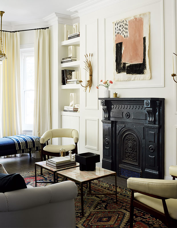 White walls are a crisp foil to aged antiques and darker finishes in an early apartment occupied by Tommy. “This is the first really white living room I’ve ever done,” admits Tommy, whose past homes were distinguished by dark, dramatic walls. Since the sofa is also neutral, it blends in and doesn’t overpower the small space. “White is also the perfect backdrop for layering in strong colors, which I chose to give the room a youthful, happy feel.”